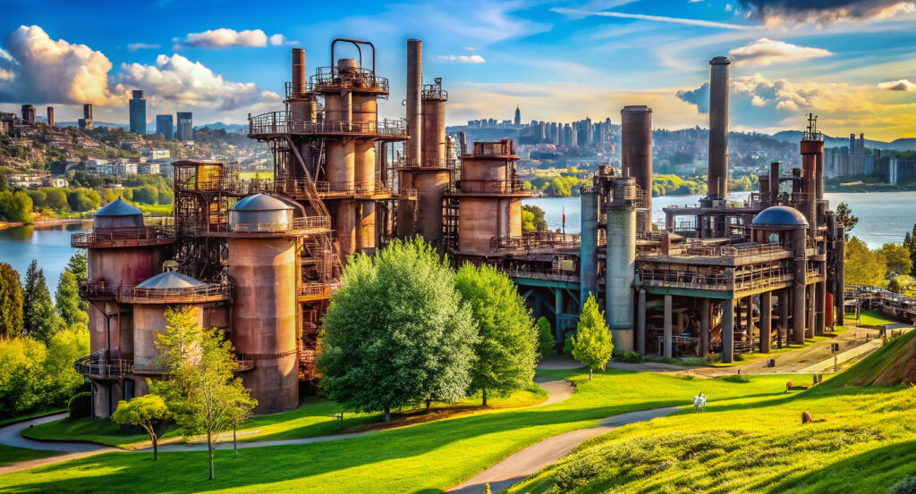 The site operated as a coal gasification plant from 1906 until 1956, leaving behind a heavily contaminated landscape of rust, residue, and debris. When the city acquired the land, many wanted the structures demolished — but Richard Haag, the visionary designer, saw art in the ashes. He pioneered one of the earliest large-scale examples of bioremediation, using plants and soil bacteria to cleanse the toxic ground instead of removing it. The preserved machinery, cleaned and painted in earthy reds and oranges, became an iconic blend of sculpture and memory — a reminder that human progress and natural recovery can coexist. The park’s design also pays homage to its industrial lineage: the Great Mound was formed from the site’s rubble, and the play barn, built within old compressor towers, turns remnants of industry into spaces of joy. Today, Gas Works Park is a symbol of urban reinvention — proof that even a scarred landscape can become a sanctuary.