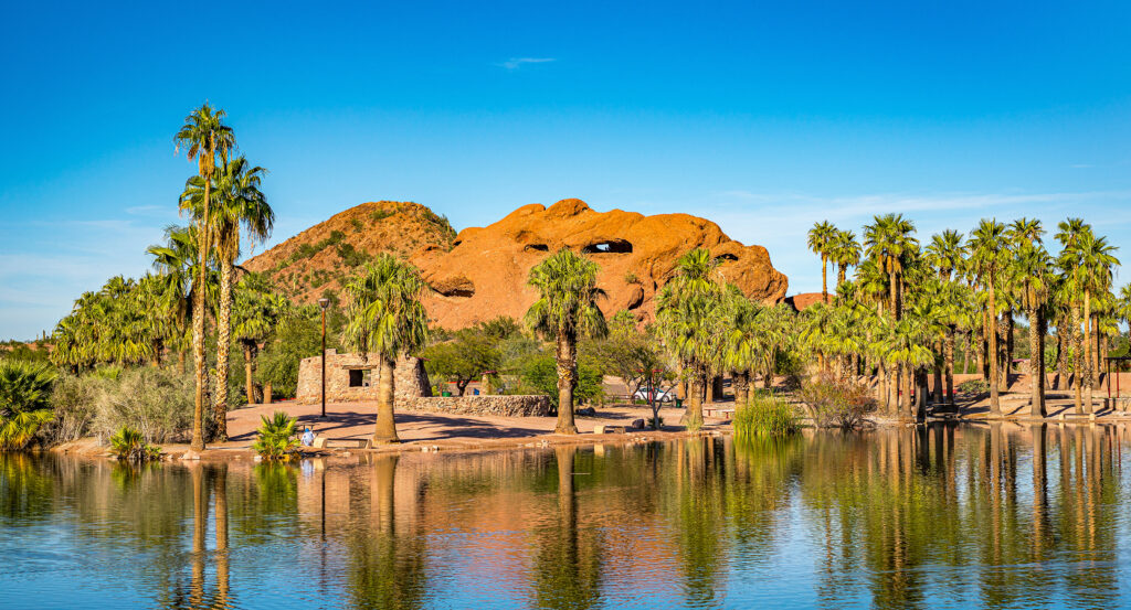 Formed millions of years ago by wind and water erosion, the sandstone belongs to the same geological family that defines the red rocks of Sedona and the canyons of Utah. Long before Phoenix existed, the Hohokam people, one of the region’s earliest known civilizations, used the formation as a natural solar calendar. Archaeologists discovered that sunlight streaming through the hole would mark specific points on the rock floor throughout the year, aligning with solstices and equinoxes. It was a celestial clock, guiding the rhythms of planting and harvest. The site later became a natural landmark for travelers moving through the Salt River Valley, and by the early 20th century, it was incorporated into Papago Park, which served as both a Civilian Conservation Corps project and later a military facility during World War II. Today, it stands as a rare meeting point between geology, culture, and urban life, a formation that has witnessed both ancient rituals and modern picnics. Its reddish hue deepens with every season, weathered by desert sun and the touch of countless visitors drawn to its quiet strength. To stand within the hole is to stand inside Phoenix’s timeline itself, an unbroken bridge between the prehistoric and the present.