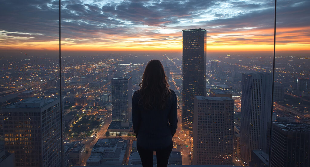 “From the observation deck the city looks endless, like Houston's just daring you to underestimate it. Down on the street you can't even spot where you were standing.”