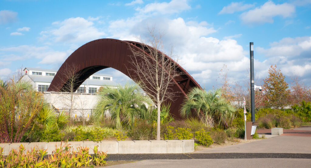 Designed by Hargreaves Associates as part of Crescent Park's 2014 debut, the bridge was engineered to reconnect the Bywater neighborhood to the river after decades of industrial isolation. Its rusted finish isn't decay but design, a self-sealing patina that protects the steel while blending perfectly with the park's reclaimed aesthetic. The bridge's sweeping curve is ADA-compliant, making the climb accessible to all while doubling as one of the city's most photogenic vantage points. It's both art and infrastructure, a bridge that looks alive, shifting hue with every change of light and season.