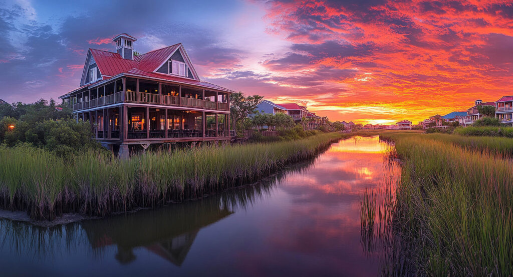 Come in the late afternoon when the light turns golden and the marshes shimmer like glass. Start your visit with a paddleboard or kayak rental from one of the local outfitters, like Nature Adventures or Coastal Expeditions, to explore the creek’s quiet inlets, where dolphins often glide alongside your board. Afterward, follow the boardwalk through Shem Creek Park for unbeatable views and photo opportunities, pausing to take in the smell of salt and pluff mud that defines the Lowcountry. When the sun begins to dip, settle into a table at one of the waterfront restaurants, Saltwater Cowboys, Tavern & Table, or Red’s Ice House are all local favorites. Order a cold drink and watch as the shrimp boats ease back into the harbor, their silhouettes framed by a watercolor sky. If you’re visiting on a weekend, live music spills across the docks, blending with the soft slap of waves against the hulls. Pair your evening here with a stop at nearby Patriots Point or the historic Old Village of Mount Pleasant for a full day of coastal exploration. By the time the lights from the bridge flicker to life across the horizon, you’ll understand why Shem Creek is more than just a destination, it’s a feeling, a reminder that in Charleston, the simplest moments by the water are often the most unforgettable.